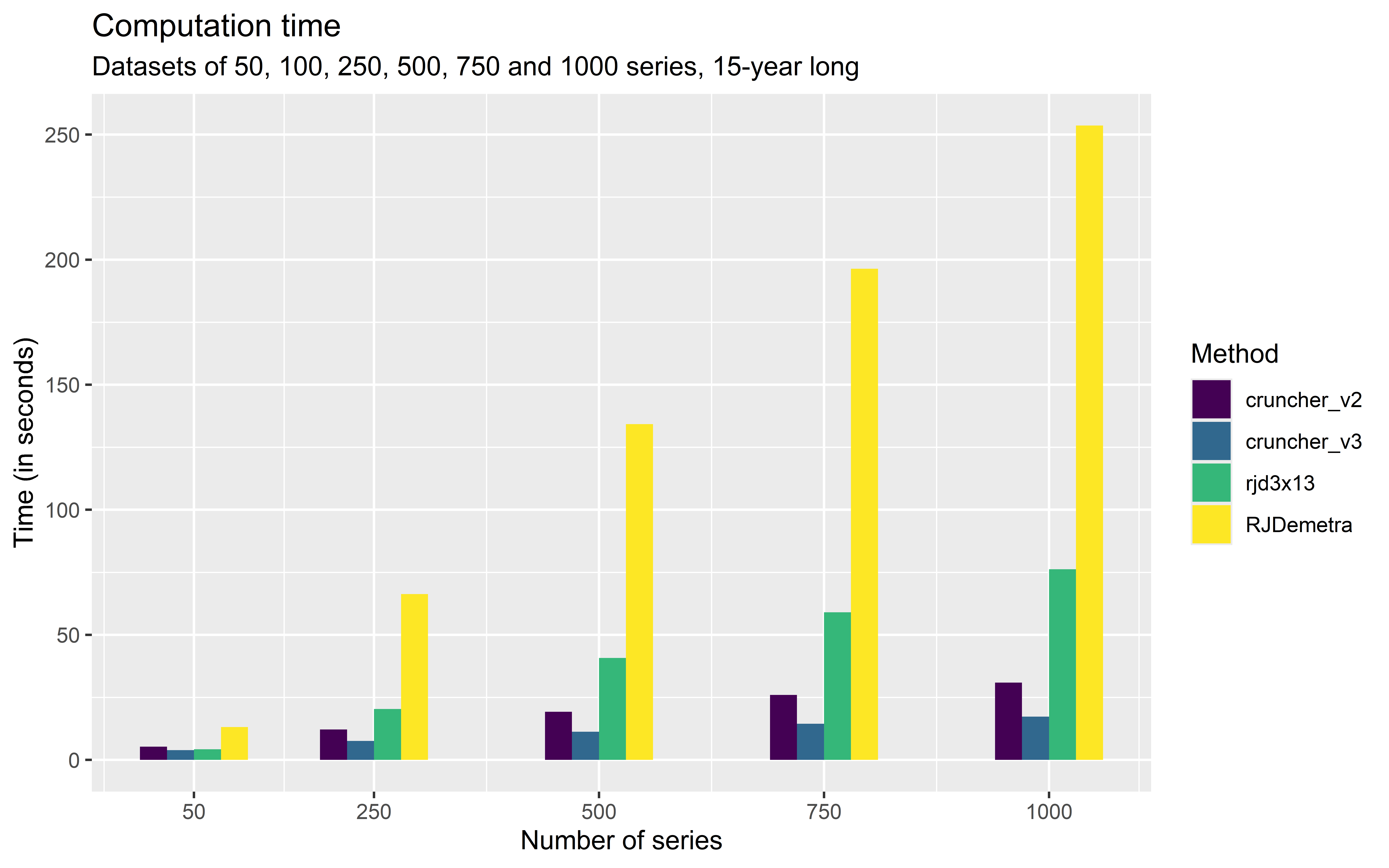 For a series number close to one thousand, the estimation with rjdx13 takes less than three minutes, which is still very reasonable for most users but far behind the Cruncher, which completes the same process in about twenty seconds.