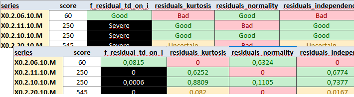 Each modality corresponds to a grade, so (“Good,” “Uncertain,” “Bad,” or “Severe”) will become (0, 1, 3, 5). The score for a series is the weighted average of its scores, and its quality is lower when the score is higher. The residual seasonality tests on the seasonally adjusted series and on the irregular have the highest weights. The complete score equation is detailed in the appendices 🔗.
